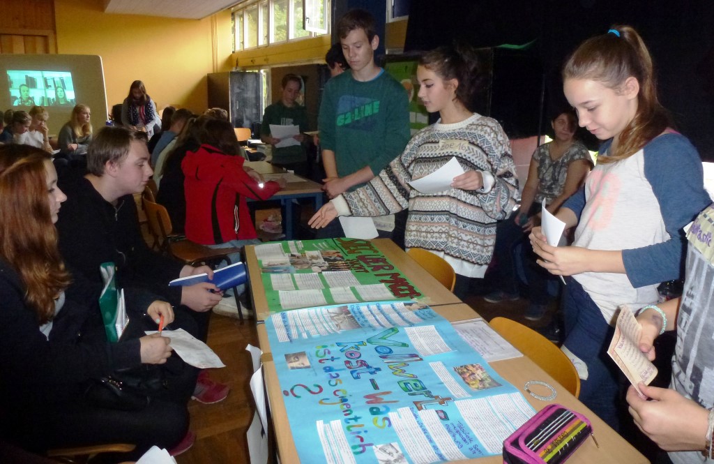 Die Ergebnisse unserer Projektarbeit wurden zusammengetragen und in einer Art „Messe der Möglichkeiten“ präsentiert. Für uns hieß das, dass wir zum einen verantwortlich für unseren eigenen Messestand und die Präsentation unserer Ergebnisse waren, zum anderen aber auch die Möglichkeit hatten, Messestände unserer Mitschüler zu beurteilen. Präsentiert wurde auf unterschiedliche Weise: Kleine Theaterstücke wurden gezeigt, PowerPoint-Präsentationen dargeboten, selbst gekochte Gerichte angeboten.
