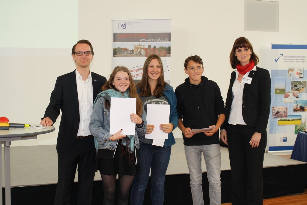 Start- und Zielpunkt der tabFUTURE war die IHK Potsdam. Dr. Dr. Mario Tobias, Hauptgeschäftsführer der IHK Potsdam, und Franziska Leupelt, stellvertretende Bundesvorsitzende der Wirtschaftsjunioren Deutschland, begrüßten alle Teilnehmer des Projekts. Die SchülerInnen konnten sich bereits im Unterricht eines der 4 Themengebiete (Aktiv anpacken / Clever wirtschaften / Herzlich handeln / Kreativ sein) auswählen und wurden dann in Teams von je drei Schülern mit Tablets und einem „Versorgungsbeutel“ ausgestattet. Über die Tablets erhielten sie die Koordinaten der Unternehmen. Wenn sie diese gefunden hatten, lernten die SchülerInnen ihren eventuellen Arbeitgeber kennen und verschafften sich einen Eindruck von den angebotenen Ausbildungsberufen.