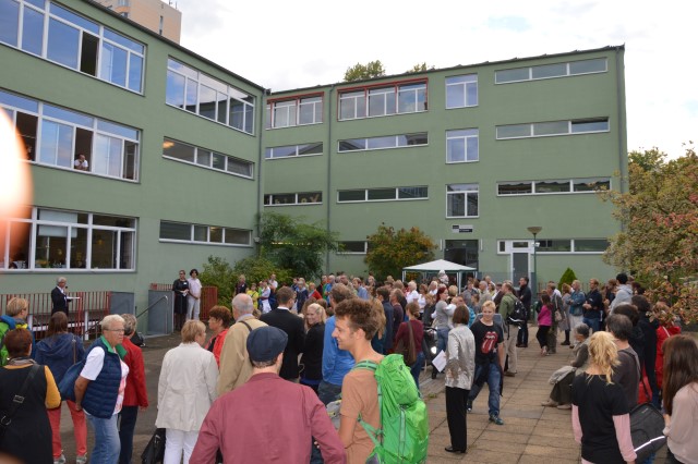 Die Gäste wurden von unserer Schulleiterin Frau Pölk auf dem Hof empfangen und konnten nach einer kurzen Begrüßung und einer kleinen Festrede des Chronisten der Voltaireschule die Attraktionen im Schulgebäude und dem Schulhof besuchen und genießen.