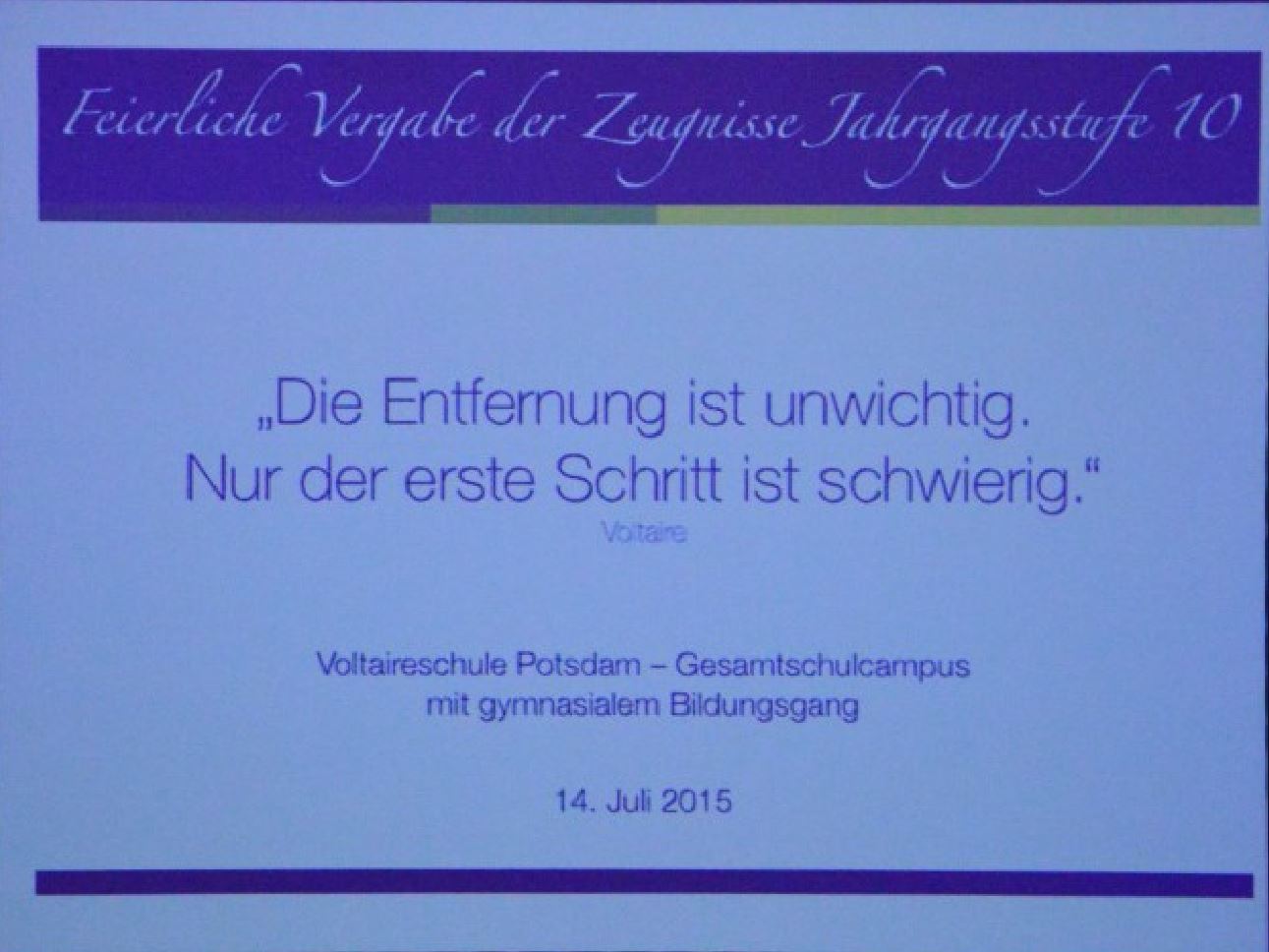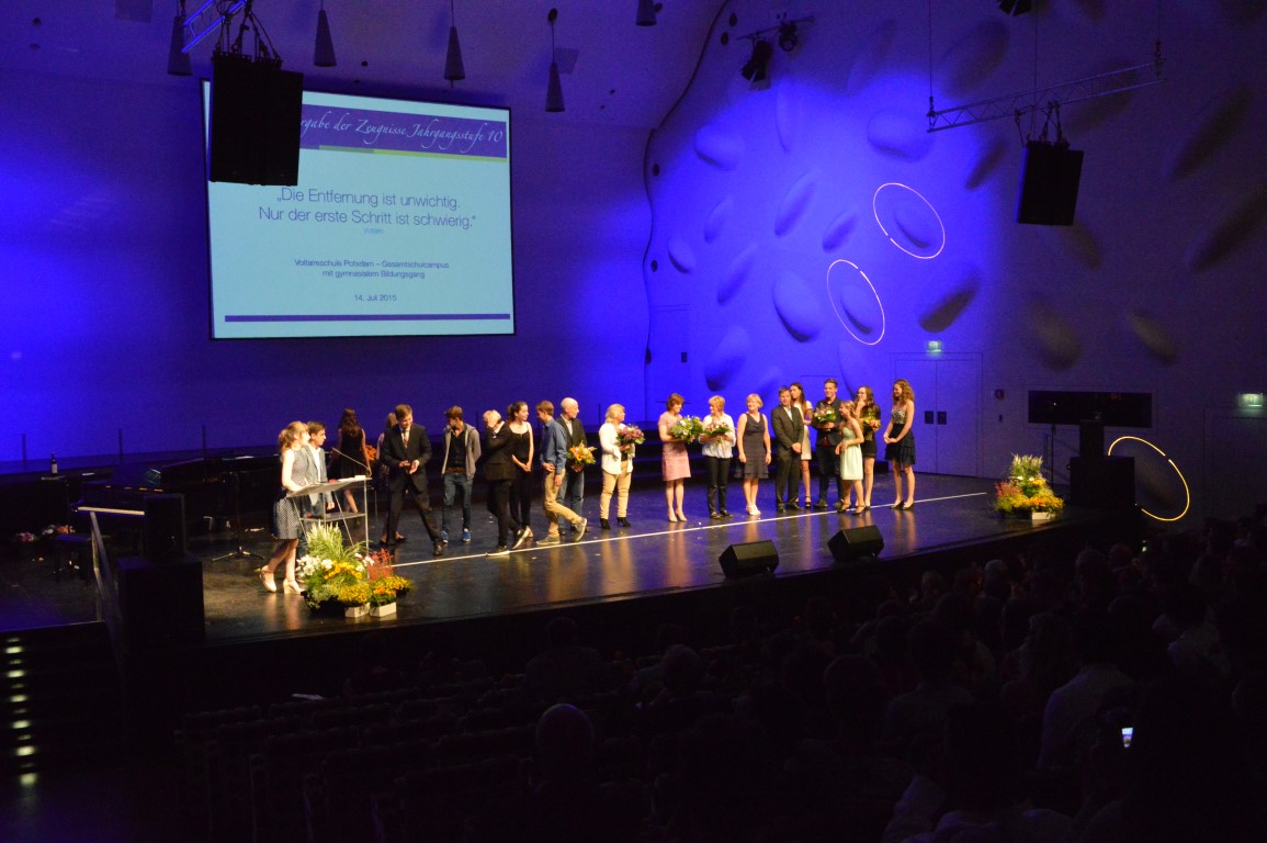 Auch in diesem Schuljahr konnten 124 Schülerinnen und Schüler der 10. Jahrgangsstufe ihr Abschlusszeugnis entgegennehmen. Die feierliche Übergabe fand am 13.07.2015 im Nikolaisaal in Potsdam statt und wurde von Musikerinnen und Musikern der Voltaireschule und Herrn Dr. Krebs begleitet.