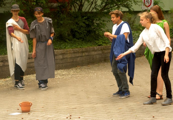Im 3. Block hatten alle Gelegenheit, von der 8 C vorbereitete Spiele zu testen. Ob klassisch römisch – wie das Deltaspiel – oder als Symbiose aus Moderne und Antike – wie das Brettspiel Actiones: Alle Spiele bereiteten großen Spaß. Dem taten selbst einige Regentropfen keinen Abbruch.