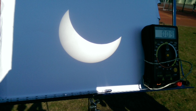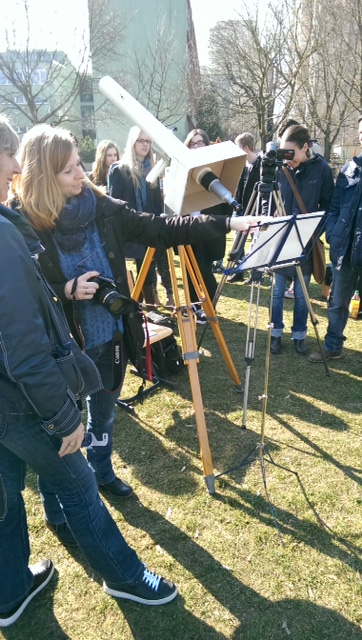 Für Interessierte wurde eine Sammelbestellung an Brillen aufgegeben. Diese waren dann auch rechtzeitig da. Für alle anderen wurde auf dem Sportplatz das Fernrohr aufgebaut, so dass zumindest die Projektion der Finsternis auf Papier beobachtet werden konnte. Da das Spektakel aber eine Weile dauerte, kam mit Brillentausch jeder in den Genuss, es direkt beobachten zu können. Die Warnungen zum Schutz der Augen wurden ernst genommen.