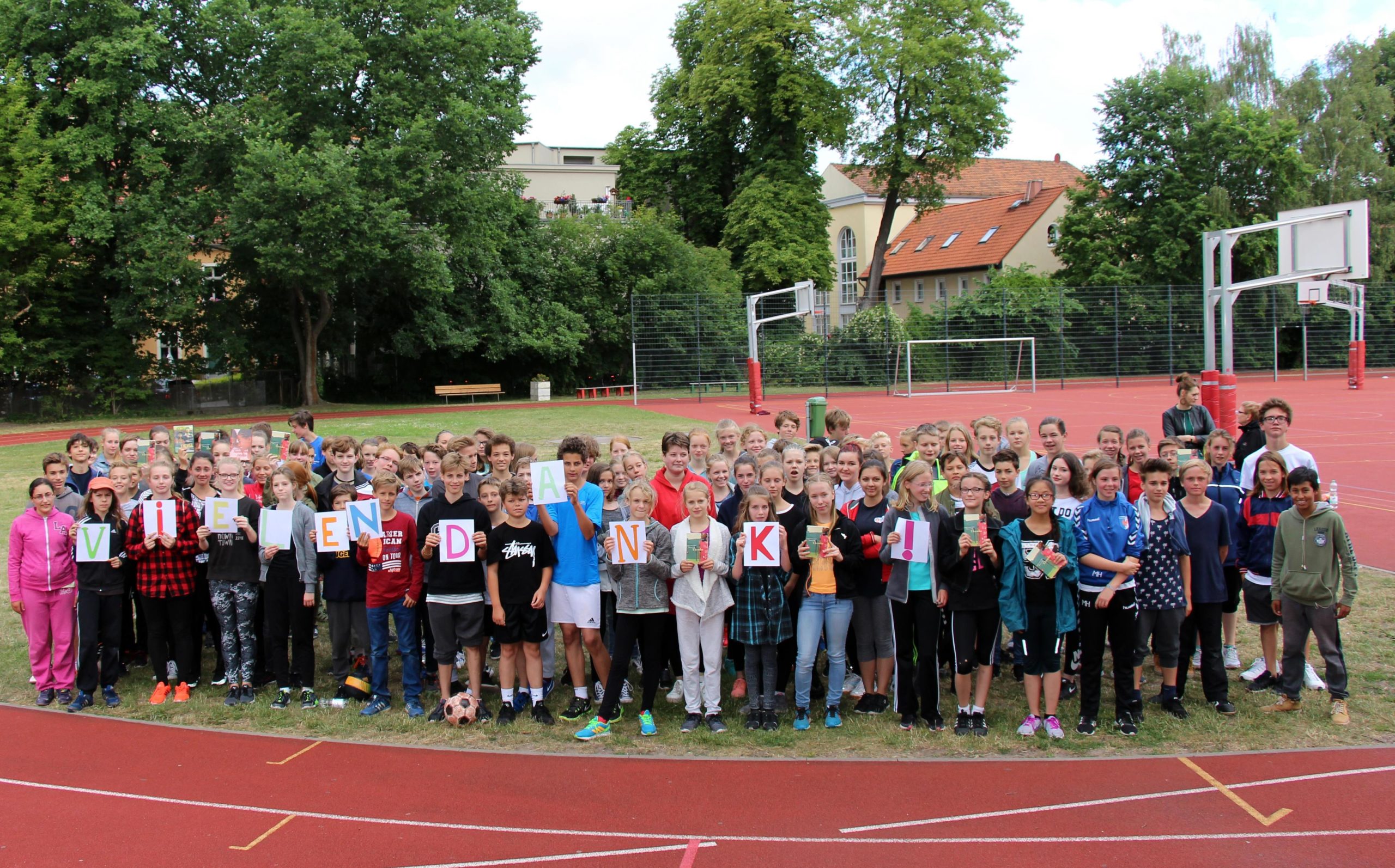 Ein besonderes Dankeschön gilt den fleißigen Eltern unseres Fördervereins, denn sie haben nicht nur die Dankeschön-Shirts finanziert, sondern mit ihrem wieder kostenlosen Getränke- und Erfrischungsstand die Akkus unserer erschöpften Schüler stetig wieder aufgefüllt und damit das sportliche Fundament sicher gestellt.
