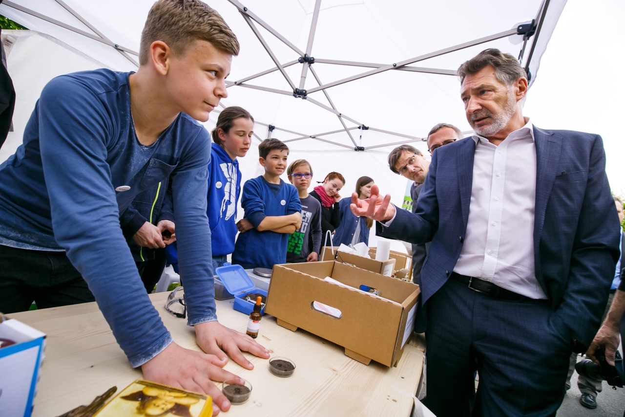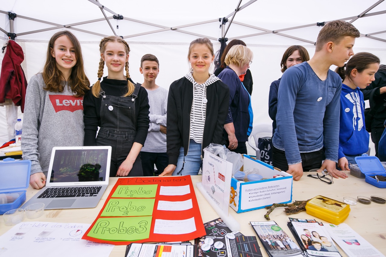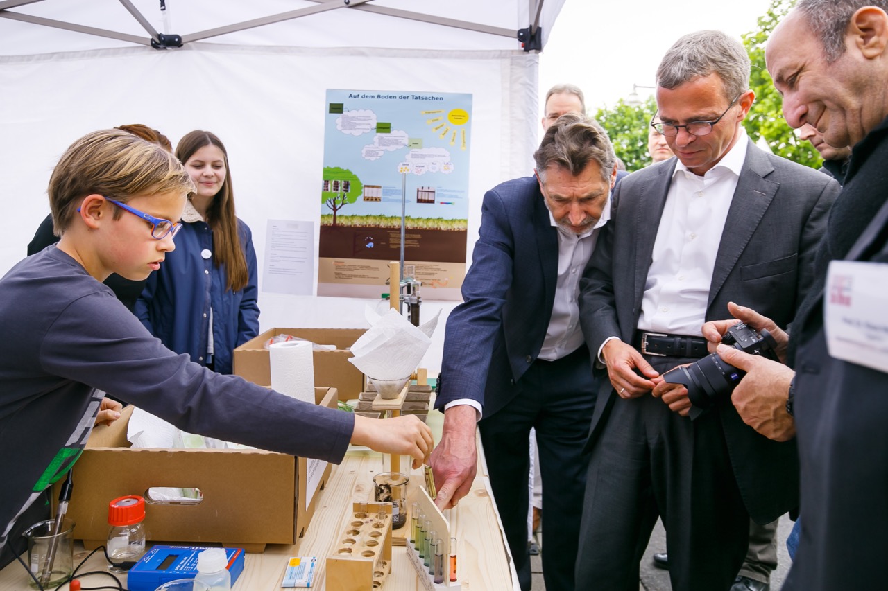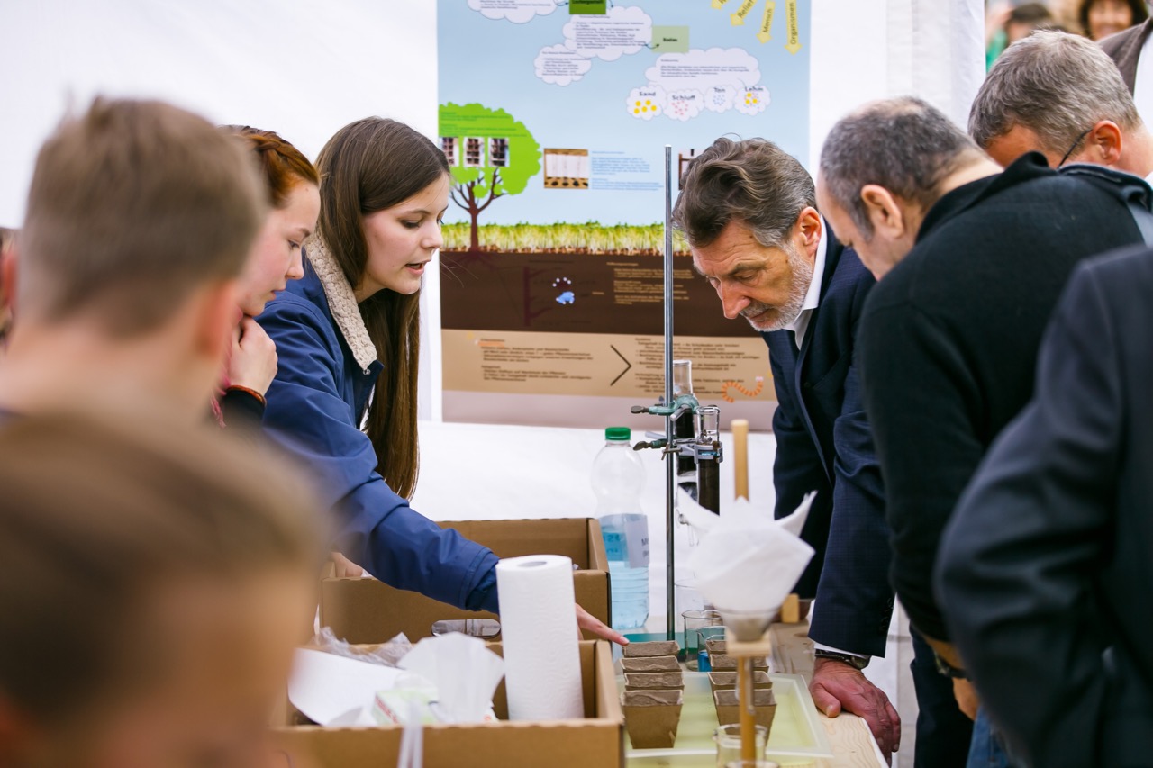 Schüler aus der 8L und 10L bewiesen praktisch, dass eine Leonardo-da-Vinci-Brücke ganz ohne Schrauben und Nägel, allein durch Reibungskräfte, hält. Diese Brücke zu überqueren war ein Highlight für alle. Die Klasse 7L zeigte chemische Experimente zum Nachweis des Kalkgehaltes im Boden, bestimmte den pH-Wert verschiedener Bodenproben und präsentierte ihre Ergebnisse zur Analyse der Bodenarten sowie zur Tierartenbestimmung. Die professionellen Erklärungen dazu überzeugten auch unseren Oberbürgermeister Jakobs und den Minister für Wirtschaft Gerber und regten zum Mitmachen an. Für Interessante Informationen zum zukunftsträchtigen Thema Bionik war Leon Maut (10L) ein kompetenter Ansprechpartner.