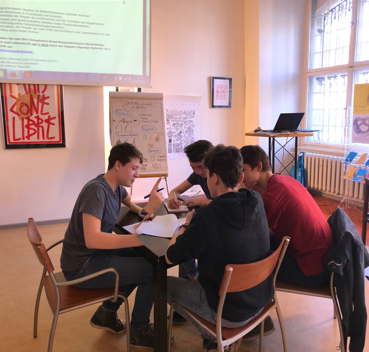 Praktische Übungen für eine erfolgversprechende Bewerbung, Auswertung authentischer Lebensläufe, Tipps für Praktikumsmöglichkeiten im französischsprachigen Ausland, Informationen über Stellenangebote im Rahmen eines deutsch-französischen Austausches: All dies und noch viel mehr bot uns ein deutsch-französischer Entdeckungstag am DFJW (Deutsch-Französisches Jugendwerk) in Berlin, zu dem wir, der Französischgrundkurs Jahrgang 12, gemeinsam mit Frau Russell am 28.03.2017 eingeladen waren.