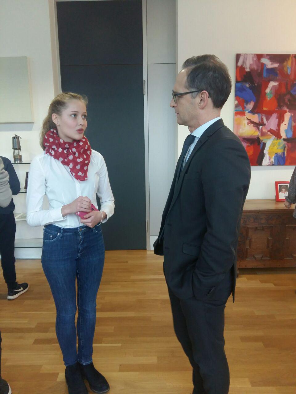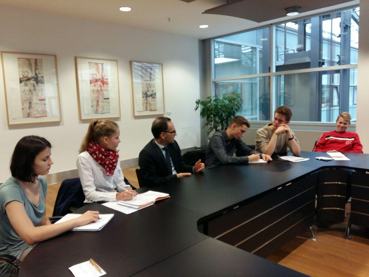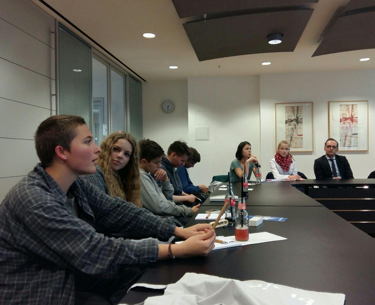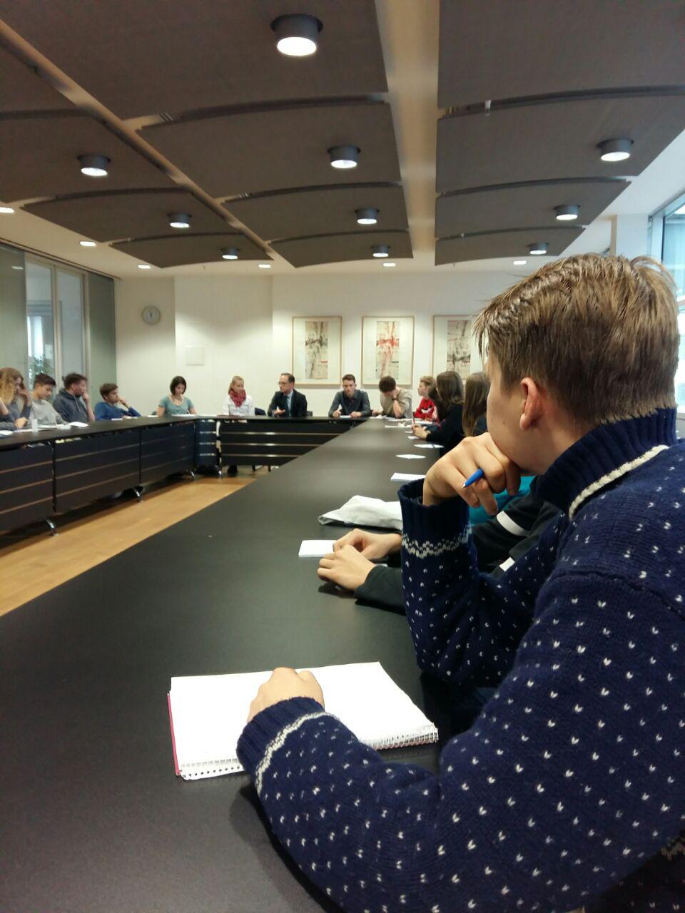 In den vergangenen PB-Blöcken hatten wir uns bereits nicht nur mit den Aufgaben des Ministeriums und Herrn Maas“ Aufgaben beschäftigt, sondern uns auch mit dem Gesetz gegen Hasskriminalität im Internet und der „Mietpreisbremse“ auseinandergesetzt, zu denen Herr Maas besonders viel beigetragen und für die er sich eingesetzt hat. In den folgenden Stunden beredeten, diskutierten und befragten wir Herrn Maas zu den verschiedensten politischen Themen, die uns beschäftigten und interessierten. Wir baten ihn um eine Stellungnahme zu den vergangenen Bundestagswahlen und zur Jamaikakoalition. Er erzählte uns, was er für möglich hält, und berichtete über die Partei SPD, in der er Mitglied ist, und warum es derzeit wieder offen ist, ob die SPD in eine Koalition mit der CDU/CSU eintreten sollte. Wir diskutierten über die „Mietpreisbremse“ und zur Hasskriminalität im Internet und fragten Herrn Maas unter anderem nach seiner Meinung zur Partei „Alternative für Deutschland“.