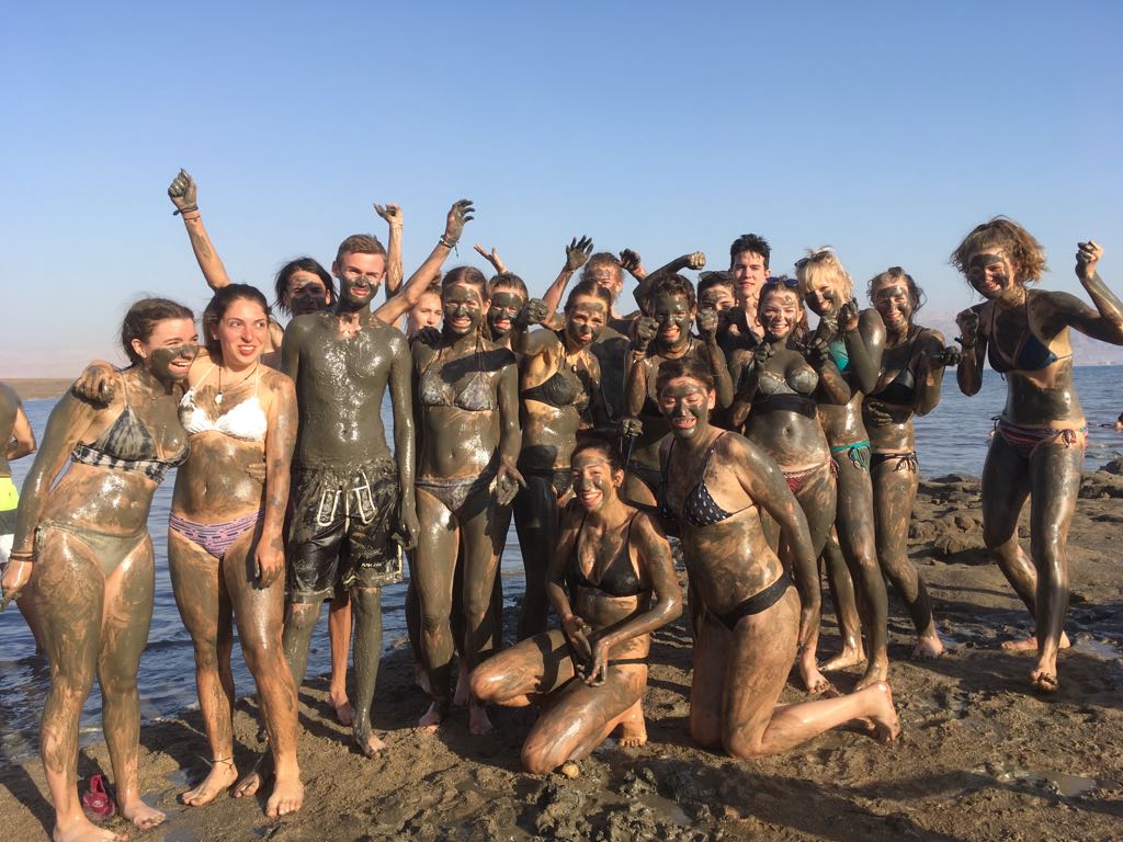 Die körperliche Anstrengung und das Schwitzen bei schönstem Sonnenschein und 29 Grad wurden dann mit einem Bad im Toten Meer belohnt. Natürlich schmierten auch wir uns mit dem berühmten Schlamm ein und ließen uns in dem salzigen Wasser treiben.