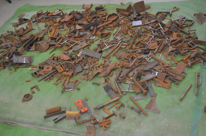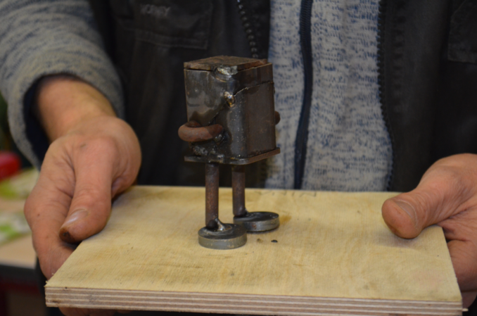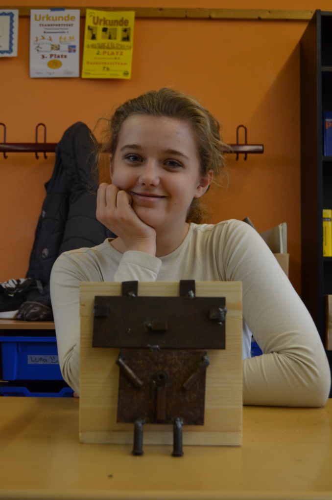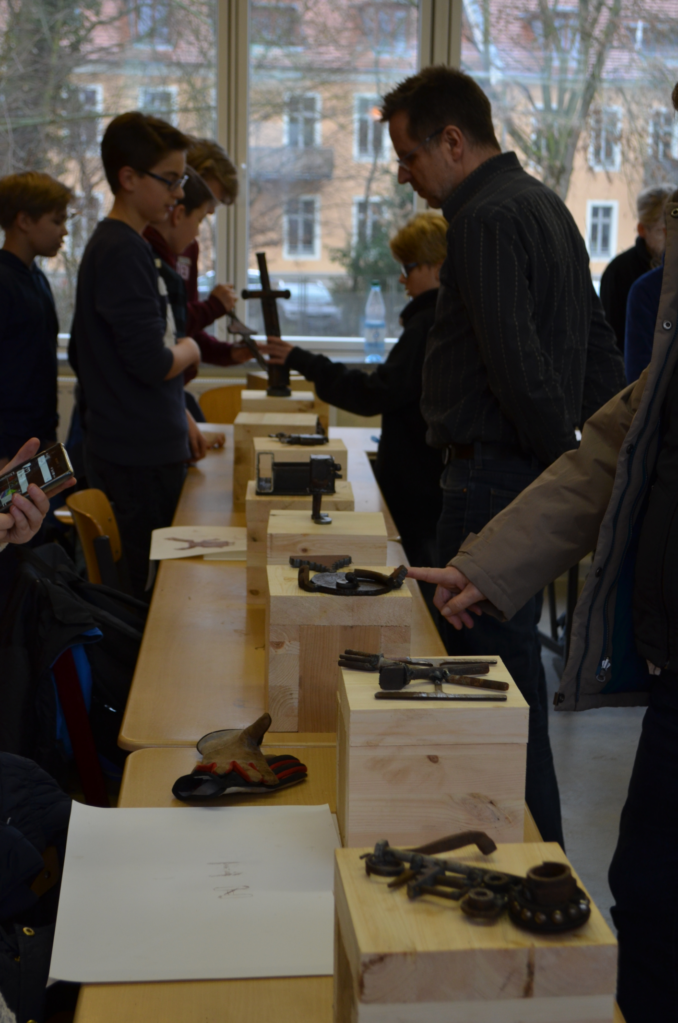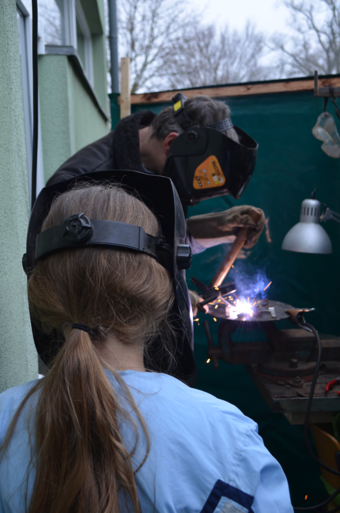 Schon in aller Frühe hatte der bildende Künstler Jost Löber vor dem Eingang der Schule seinen mobilen Schweiß-Arbeitsplatz eingerichtet; im nahegelegenen Klassenraum liegt Eisenschrott säuberlich auf dem Fußboden ausgebreitet. Darum herum sieht man zehn Schülerinnen und Schüler des 7. Jahrgangs, die dieses ungewöhnliche Material betasten und sorgfältig passende Teile für ihr individuelles Kunstwerk auswählen.