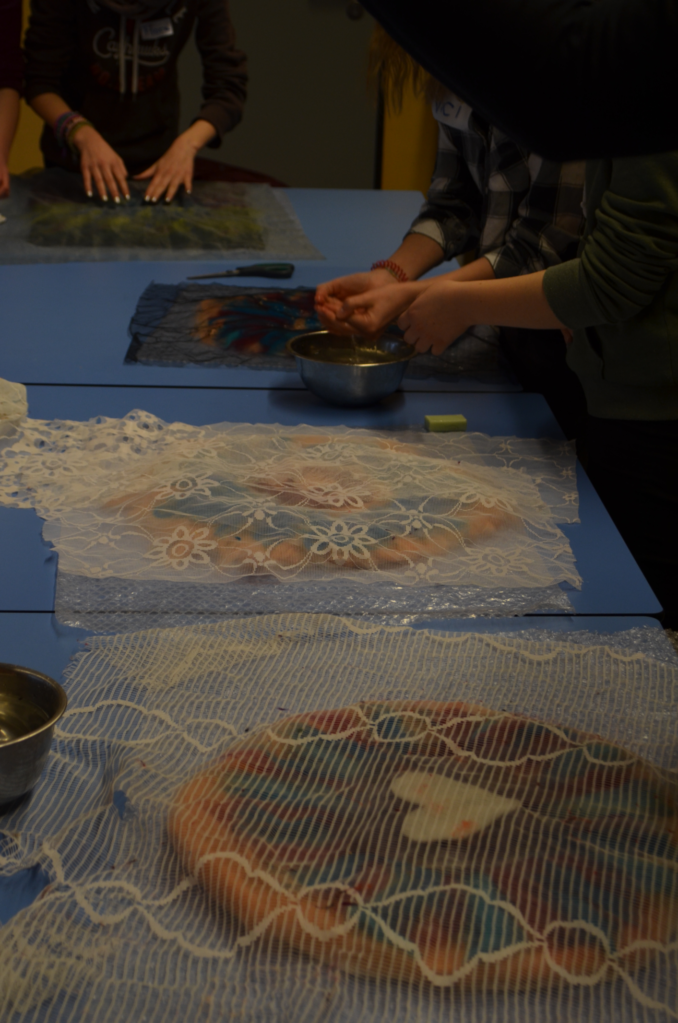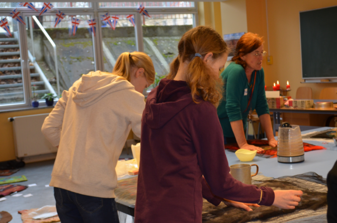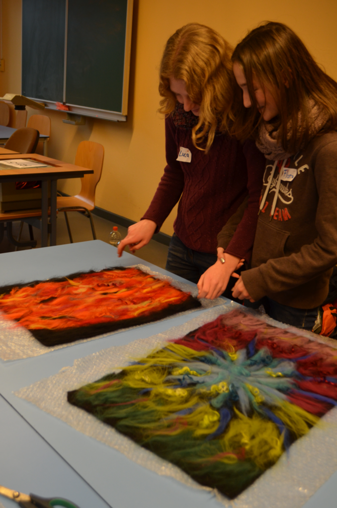 Rein mit Naturmaterialien arbeitet dagegen Gabriele Küther-Staudler in der Filz-Werkstatt. Hier werden die Teilnehmerinnen und Teilnehmer in einer stimmungsvollen Atmosphäre bei Kerzenschein und auf Filzunterlagen zunächst angeregt, über das eigene Element nachzudenken, um sich dann mit diesem kunsthandwerklich auseinanderzusetzen. Die Produkte können während einer Präsentationsphase in der Mittagszeit auch weitere Besucher bestaunen. Dies sind vor allem interessierte Lehrerinnen und Lehrer der Voltaireschule, die eine Pause während ihrer parallel stattfindenden Fortbildungsveranstaltung eingerichtet haben. Mit leuchtenden Augen zeigen nun die Schülerinnen und Schüler stolz ihre Kunstwerke und stehen ihrem staunenden Publikum für Fragen zur Verfügung.