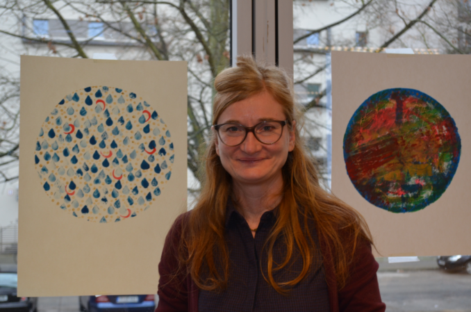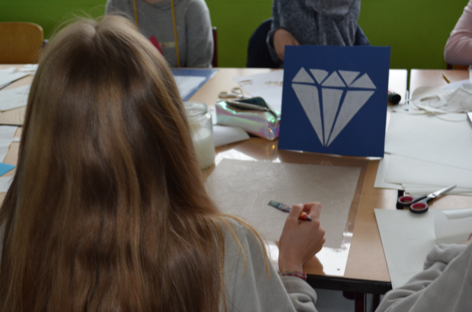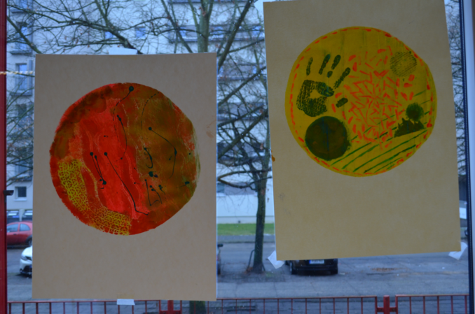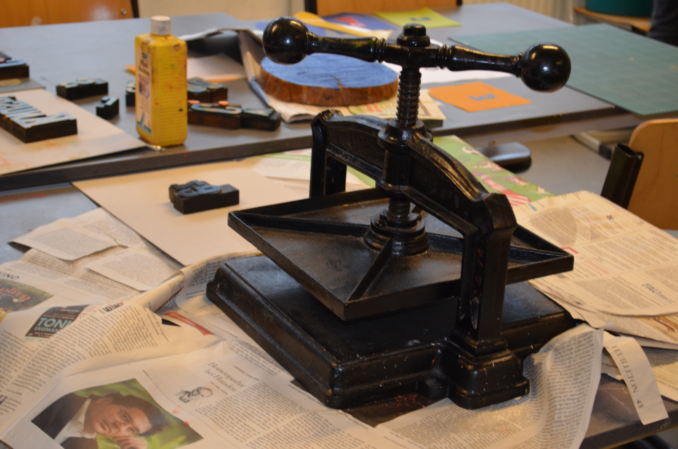 Auch in der Papier- und Stempelwerkstatt von Gudula Polze steht das gemeinsame Herstellen von Kunstwerken im Vordergrund. Die Schülerinnen und Schüler erfahren hier im sogenannten „Karussel-Verfahren“, wie bereichernd es sein kann, wenn man anderen in einem gemeinsamen Schaffensprozess in vertrauensvoller Atmosphäre das selbst begonnene Kunstwerk zur Vervollständigung übergibt.