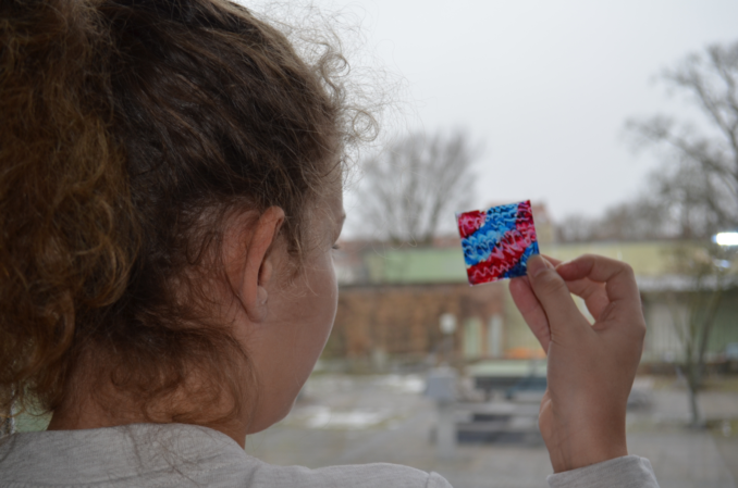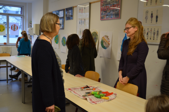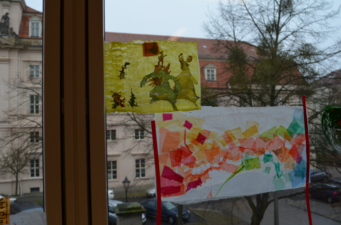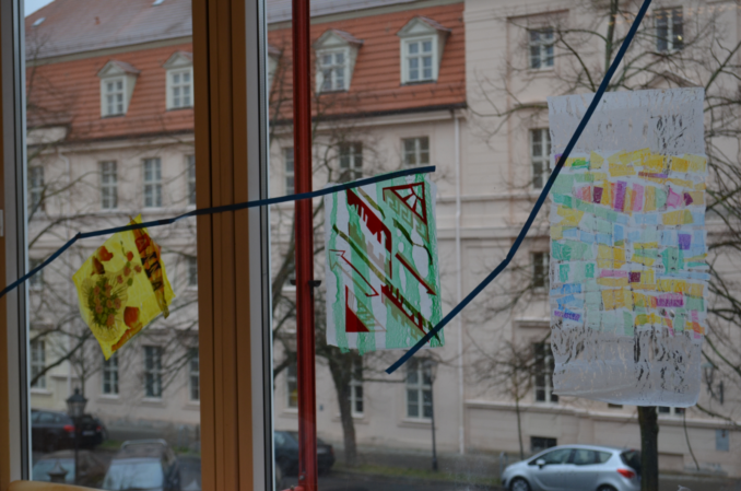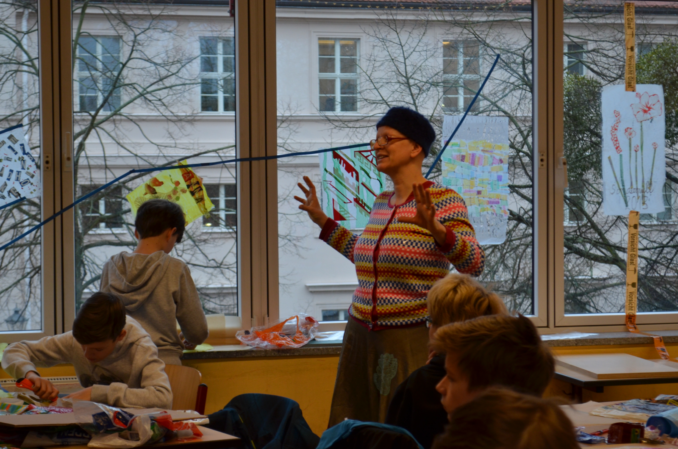 In zwei weiteren Klassenräumen dieses Gebäudeteils betrachten Schülerinnen und Schüler kleine Dinge, die sie aus ihrer eigenen Lebenswelt mitgebracht haben, ganz nah mit einer Lupe und stellen eine „Erfahrungsbox to go“ bei Marion Mack her oder erstellen in der von Birgitta Aßhauer geleiteten Werksstatt hoch konzentriert Fensterbilder aus Papier.