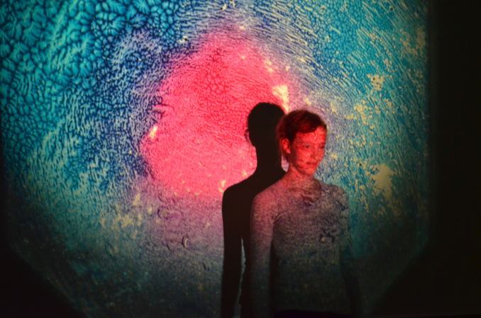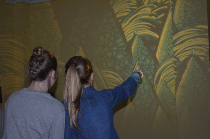 Völlig aus dem Schulalltag herausgerissen ist man auch beim Besuch der Sinneswandel-Werkstatt von Thomas Bartel. In einem abgedunkelten Raum werden hier über Dia-Projektoren Glasscheiben projiziert, die zuvor von den Schülerinnen und Schülern in einem aufwändigen Prozess selbst hergestellt wurden. Nun tauchen die Siebtklässler quasi in ihre selbst erschaffenen Welten ein und verschmelzen mit ihrem Kunstwerk…
