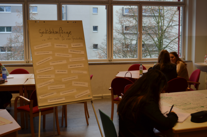 In allen Werkstätten herrscht an diesem Vormittag volle Konzentration auf das eigene Schaffen. In der Werkstatt für kreatives Schreiben von Reglindis Rauca hört man nur das Geräusch, das Stifte auf Papier erzeugen. Hier sind Reflexionsprozesse in Gang gesetzt worden, die nun ihren Ausdruck in selbst geschrieben Texten finden.