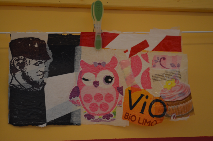 Sehr bunt geht es auch zu in der Werkstatt der Berliner Künstlerin Alena Willroth. Hier setzten sich die Teilnehmerinnen und Teilnehmer auf dadaistische Weise mit ihrer eigenen Konsumwelt auseinander, indem mitgebrachte Einkaufstüten aus Plastik zerschnitten, neu zusammengesetzt und schließlich mit der Bügelpresse zu collagenartigen Kunstwerken verschmolzen werden.