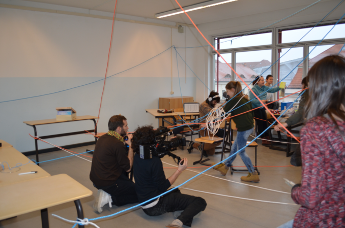 Aber nicht überall geht es ganz so ruhig zu. Im Obergeschoss ist ein Raum ganz verwoben mit Seilen, Besucher der Werkstatt von Friedericke Maltz müssen sich hier in körperlich herausfordernder Art durch die Raumskulptur winden, die vorher von den Teilnehmerinnen und Teilnehmern dieser Werkstatt gemeinsam geschaffen wurde.