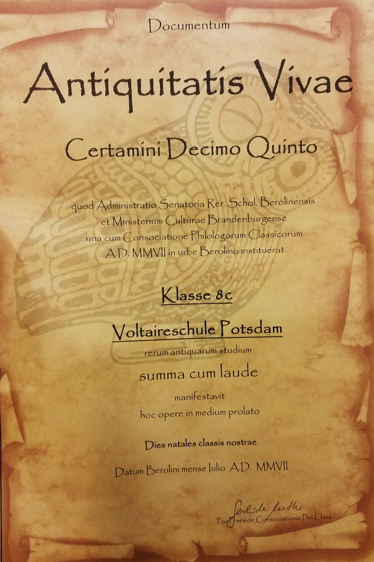 In diesem Jahr fand zum 15. Mal der Wettbewerb „Lebendige Antike“ des DAV-Landesverbandes Berlin-Brandenburg statt. Aufgabe war es diesmal, einen Kalender zu einer Lehrbuchlektion zu gestalten. Diese Herausforderung nahmen neben mehr als 100 Teilnehmern anderer Schulen auch der Lateinkurs der Klasse 7L sowie acht Schüler der Klasse 8C gern an.