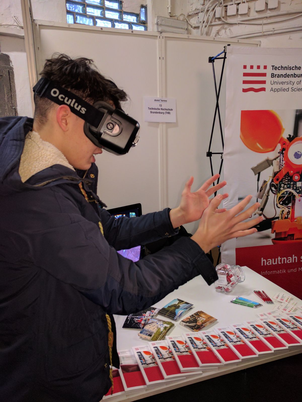 Um 09:00 Uhr werden wir eingelassen und stürzen uns sogleich ins Gedrängel. Es ist überraschend voll in der kleinen Messehalle, deren Wände mit Ständen von unterschiedlichsten Firmen und Organisationen gesäumt sind. Von Grafik-Design über Journalismus bis hin zum bewegten Bild ist alles vertreten. Am Ende der Halle befindet sich ein Podium, auf dem regelmäßig Vorträge präsentiert werden. Für eine kleine Pause kann man sich in die Nebenhalle begeben, wo Snacks und Spiele auf einen warten.