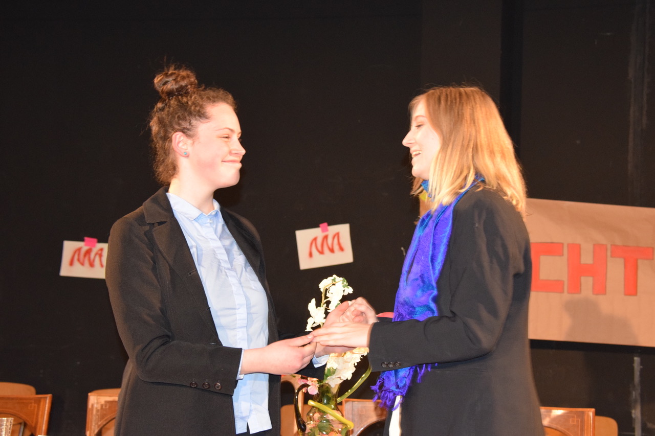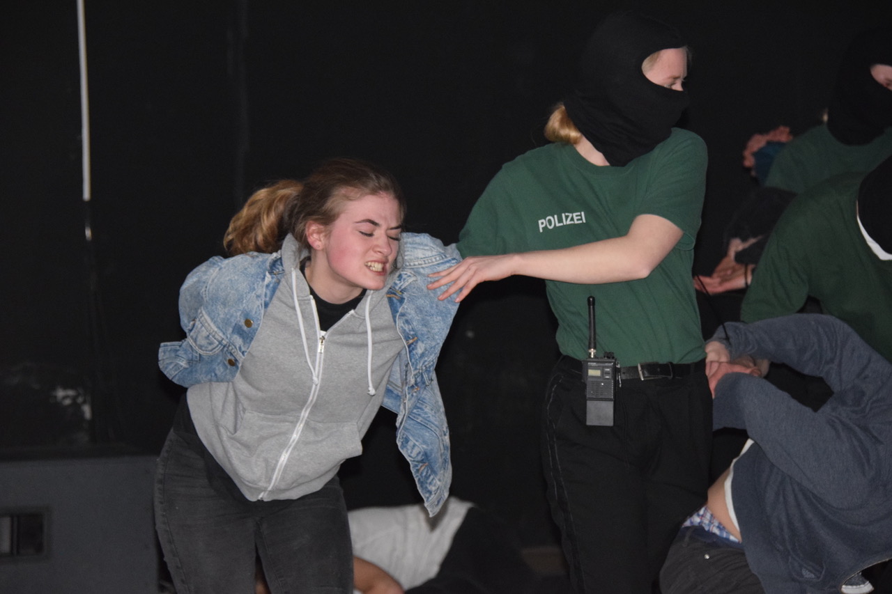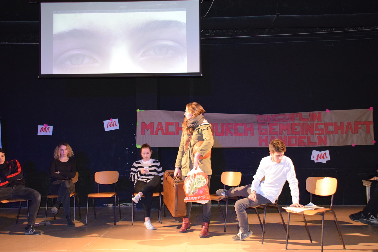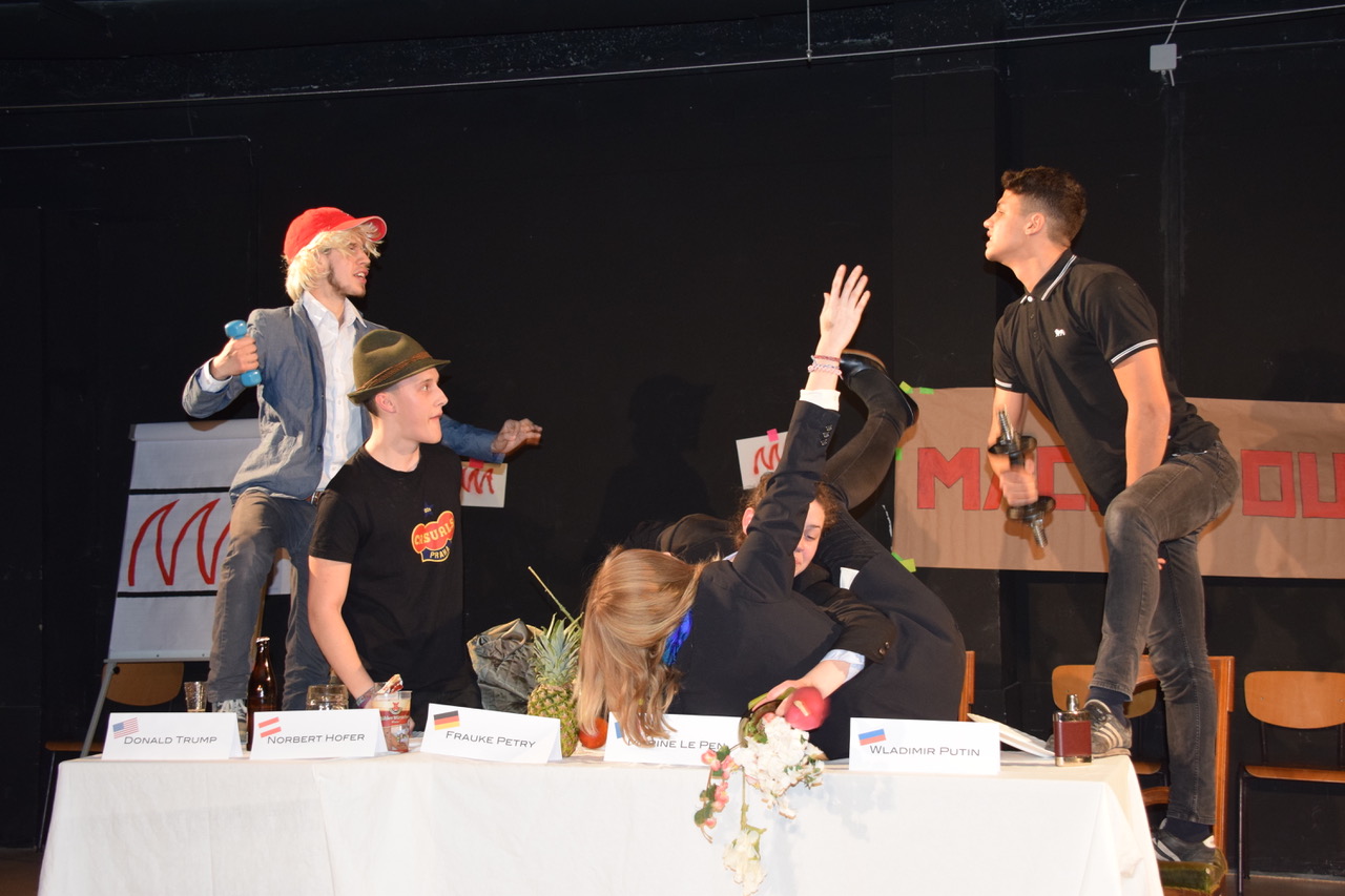 Politisch aktueller ging es mit dem Theaterkurs von Herrn Gutschmidt weiter, der in Gegen den Strom eine Adaption des Filmes Die Welle zeigte und dabei vor allem das Thema Ausgrenzung in den Mittelpunkt stellte. Mit einer Vision, die man als heitere Warnung vor dem Chaos populistischer Politik verstehen könnte, ließ man u.a. Donald Trump auf Frauke Petri treffen, die sich selbst einmauerten, oder wagte den Versuch eines neuen G 88-Gipfels, bei dem sich am Ende Putin und Trump die Pistolen an die Schläfen hielten.
