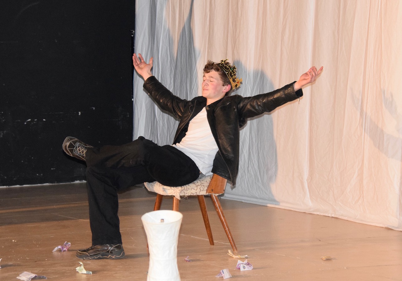 Es ist Freitag, 15:45 Uhr, und vor dem Eingang der Aula hat sich eine Polizeitruppe aufgebaut, die die herannahenden Zuschauer kontrolliert. Wem das herumpöbelnd nicht passt, der wird niedergestreckt. Polizeigewalt bekommen auch die ersten Kreuzberger Hausbesetzer um Ralph Möbius, alias Rio Reiser, im Stück Der König ist tot zu spüren. Mit der Lebensgeschichte des Sängers hat sich der Theaterkurs von Frau Lehmann beschäftigt, Texte und Szenen aus seiner Autobiographie, seinen Songs und Interviews zu einer Szenencollage choreographiert und so ein Stück politische und menschliche Vergangenheit auf die Bühne gebracht.