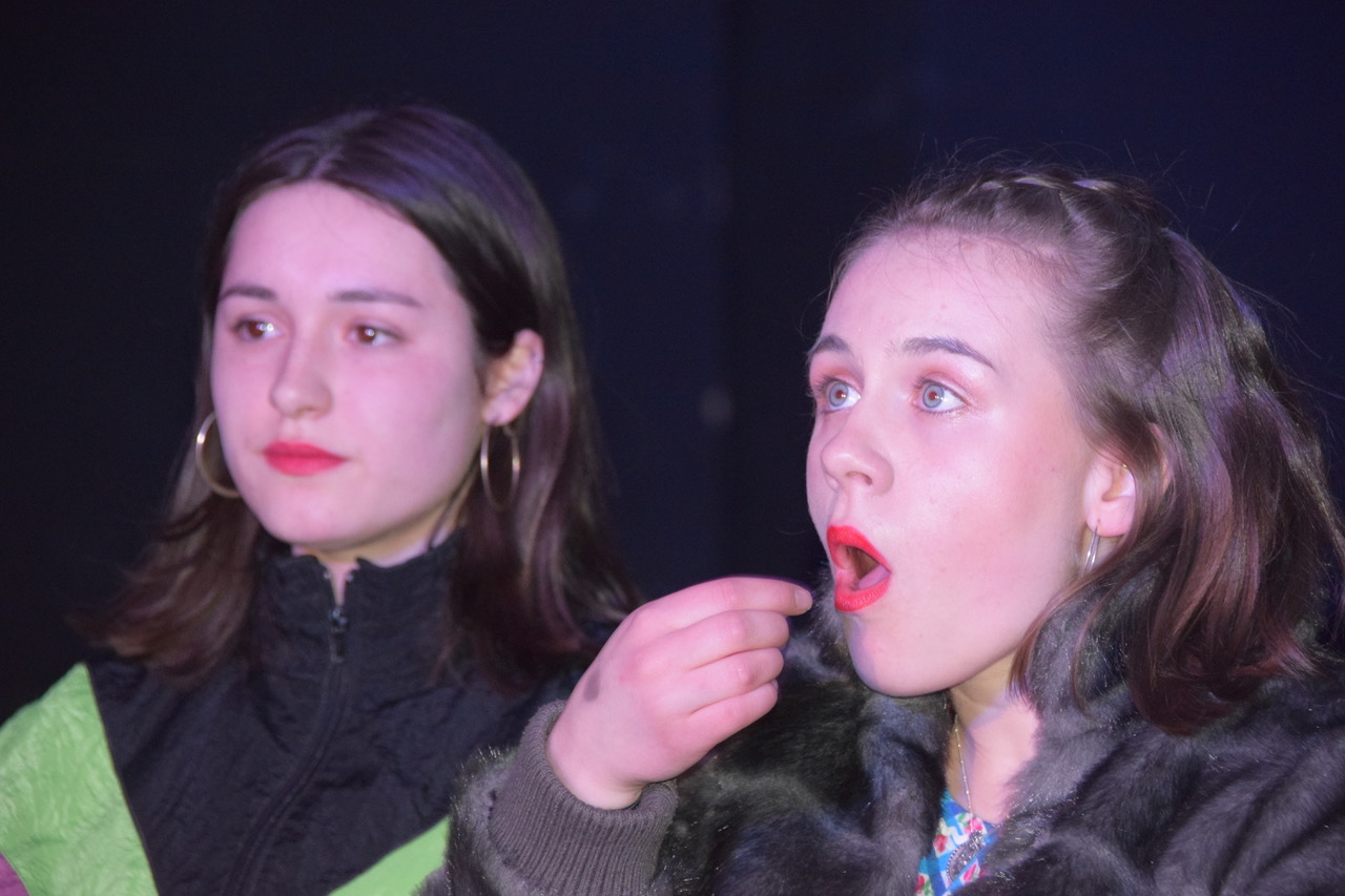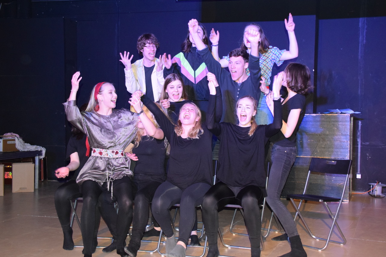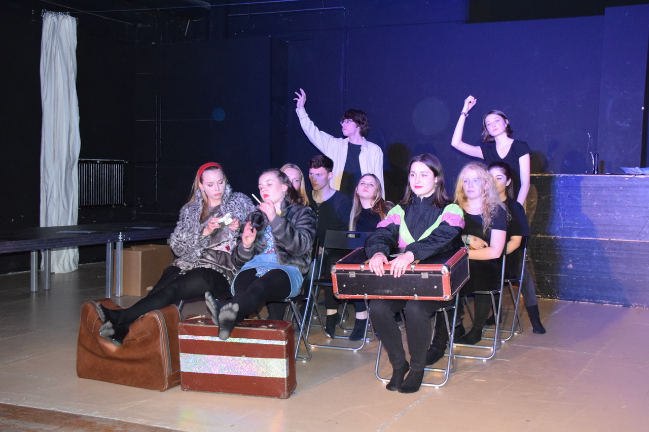 Zur Russendisko in die Emigrantski Republic lud dann der Kurs von Frau Grobler ein. Wir begleiten drei jungen russische Frauen bei ihrem Start in Deutschland, erfahren aber gleichzeitig von noch weiteren Einwanderer-Schicksalen um und nach 1989. Wovon träumt man, wenn man in ein neues Land kommt, welche bürokratischen Hürden türmen sich auf und warum fragen russische Einwanderer lieber den Radiodoc? Es wird viel Wodka getrunken in dieser Inszenierung, und es wird viel getanzt. Das steckt an, und so endet dieser Premierentag mit einer gemeinsamen Tanzrunde aller 13er-TheaterschülerInnen.