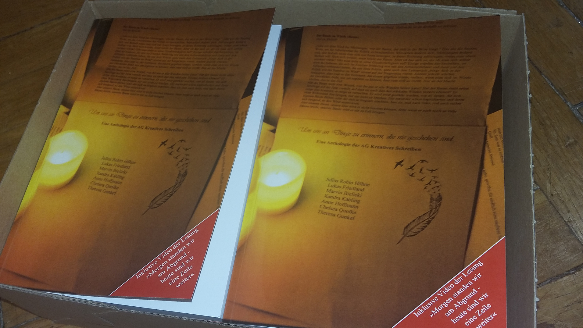 Nachdem wir das schwere Schultor aufbekommen hatten, konnte das Aufbauen in der Aula beginnen. Rede, Buffet und eine kleine Lesung waren geplant an diesem Samstag, dem 02.09.2017, bei der Release-Veranstaltung der ersten Anthologie der AG Kreatives Schreiben.