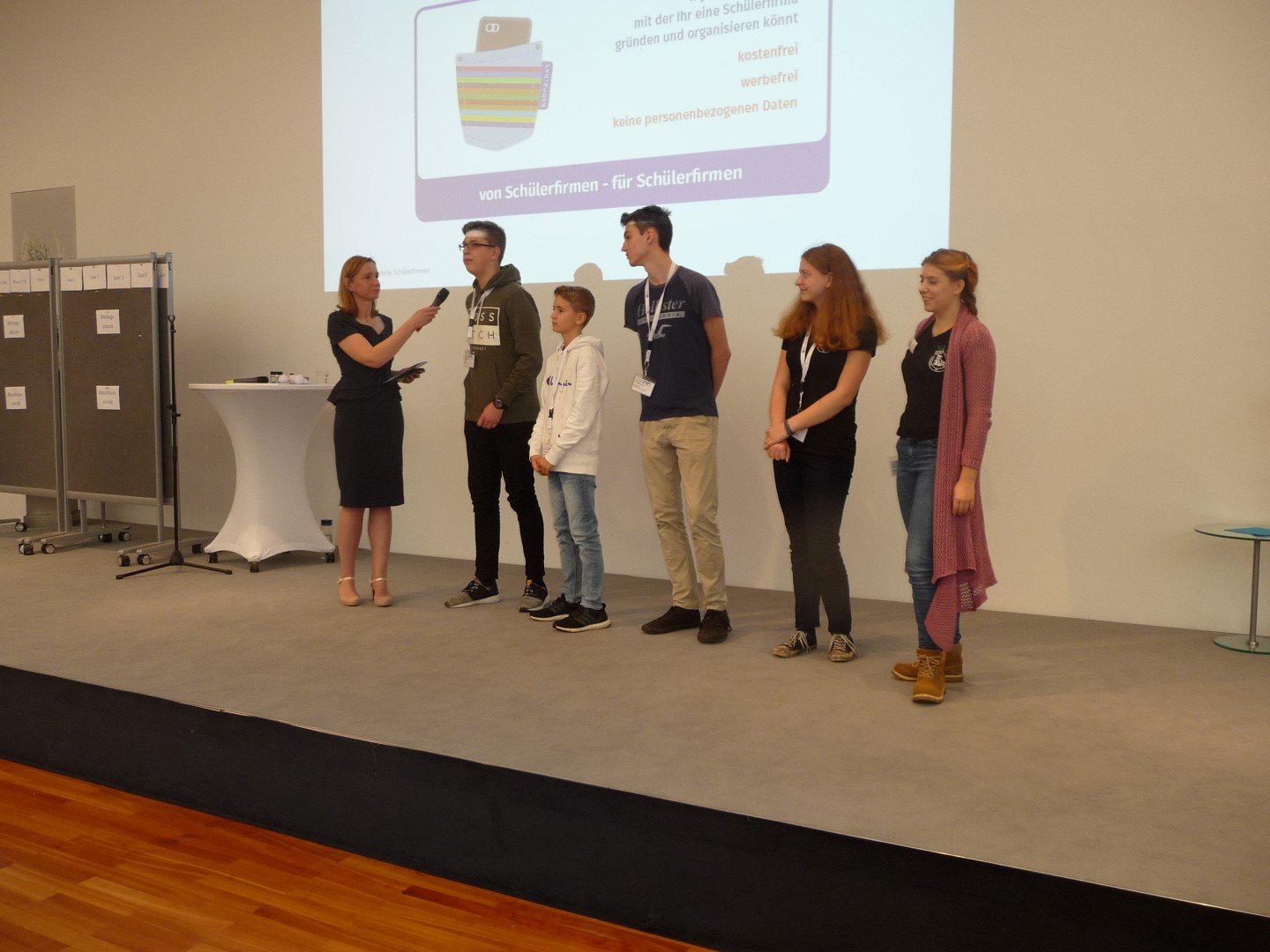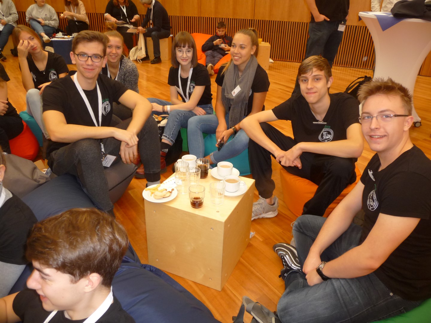 Danach erfolgte eine kurze Vorstellungsrunde. Wir hatten alle unsere Shirts der Schülerfirma an, das war schon sehr beeindruckend. Nachdem uns der Tagesplan vorgestellt wurde, konnten wir all die Themen, die uns interessieren, auf Zettel notieren. Diese wurden an einer Pinnwand gesammelt und dort einem von drei Zeitfenstern und einem Raum zugeordnet, so dass man sehen konnte, welches Thema zu welcher Zeit in welchem Raum besprochen wird. Wir hatten Gelegenheit, uns auf allen Gebieten mit Schülern der anderen Schülerfirmen austauschen. So konnten wir viele neue Produktideen sammeln, uns mit der Schülerfirmen-App vertraut machen oder uns über Themen wie Finanzen, Buchführung, Mitarbeitergewinnung austauschen.