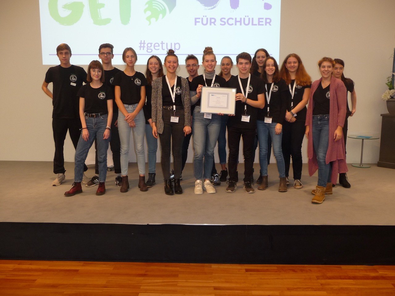 Um 09:00 Uhr wurden alle Schülerfirmen durch den Präsidenten der IHK, Peter Heydenbluth, begrüßt. Weitere Redner mit Grußworten und Ansprachen folgten. Im Anschluss wurde durch Frau Weinkauf die erste Schülerfirmen-App vorgestellt. An der Entwicklung der „mySchüfi App“ waren VertreterInnen unterschiedlicher Schülerfirmen beteiligt. Stellvertretend für unsere Schülerfirma schilderte Lea Herzfeld kleine Eindrücke von der Entwicklungsarbeit der vergangenen Jahre und nahm stellvertretend eine Auszeichnung entgegen.