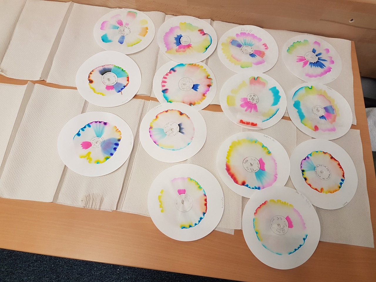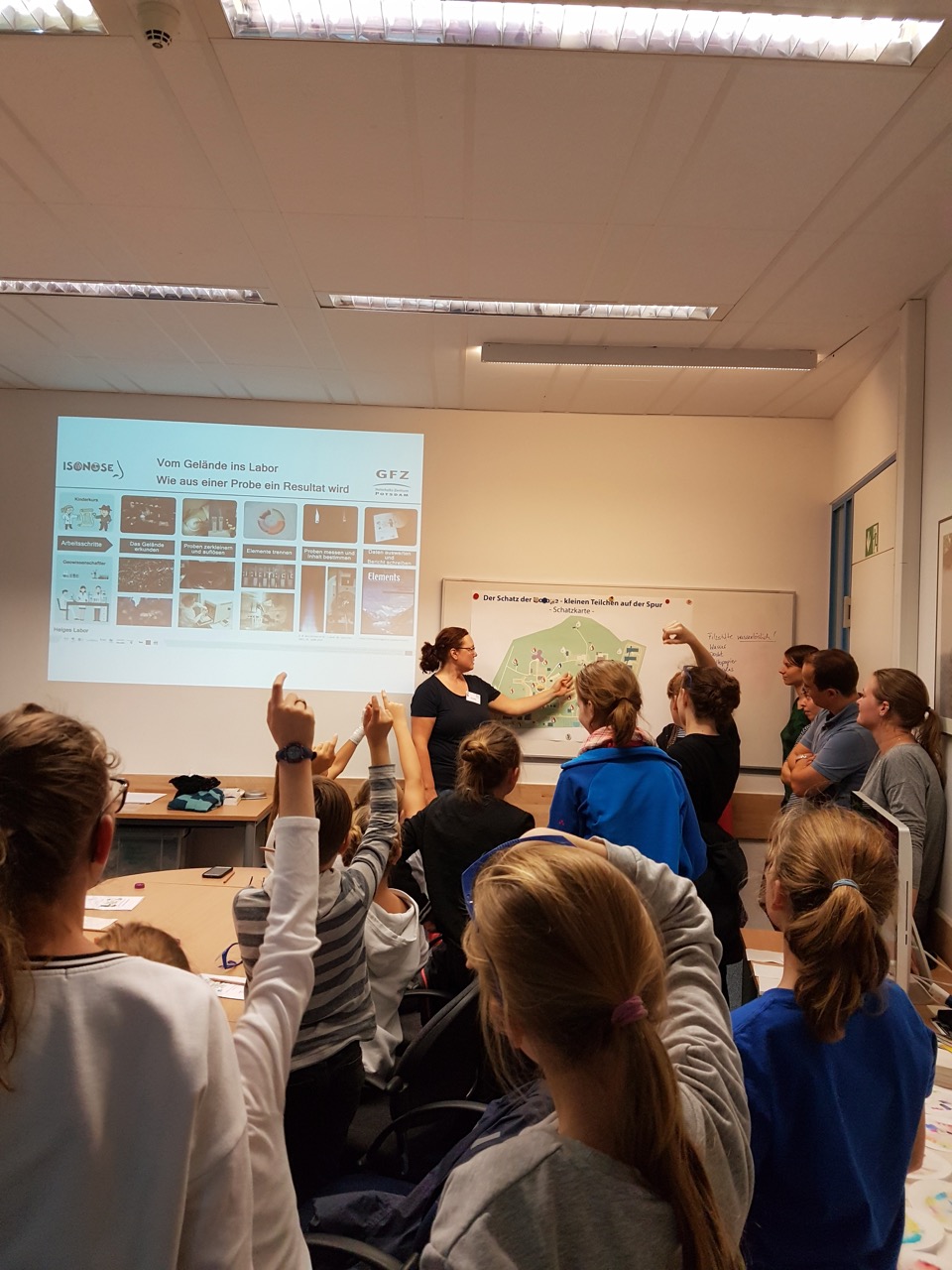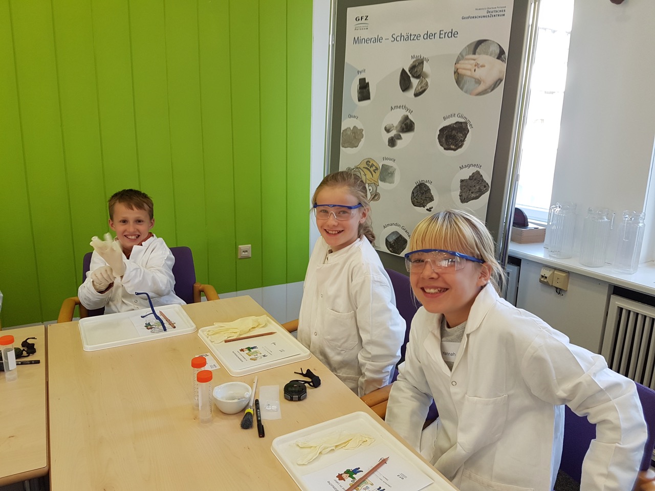 Wir kamen an und wurden sogleich nett empfangen. Wir erfuhren etwas über die Elemente Kalium, Kalzium, Lithium und Barium. Dann mussten wir eine Tablette mörsern, die aus einem der vier Elemente bestand. Diese lösten wir dann in einem Röhrchen auf und gingen damit in ein richtiges Labor.