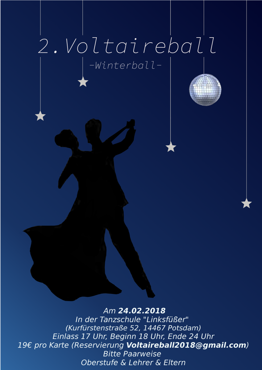 Am 24.02.2018 fand zum zweiten Mal in Folge der Voltaireball unter dem Motto “Winterball” statt. Um 18:00 Uhr begann für die rund 100 Gäste das offizielle Programm des Abends. Die Moderatoren Valentin Eckhard und David Grethe führten das Publikum mit ihrer charmanten Art durch den Abend.