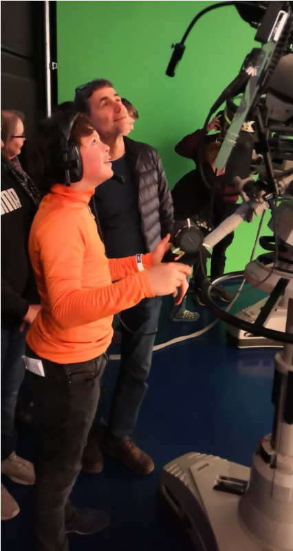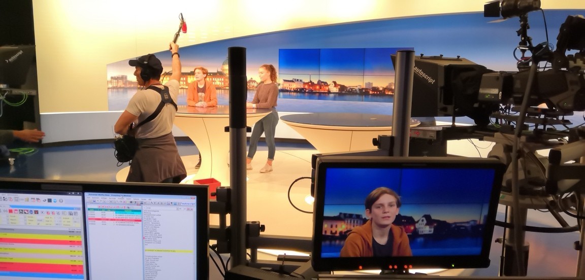 Unsere Klasse durfte dazu sowohl die komplette Technik nutzen als auch die Moderation übernehmen. Sieben Beiträge wurden aufgenommen, und bei jedem einzelnen geschahen natürlich unvorhergesehene Pannen, die sowohl für Verwirrung als auch Lacher sorgten. So mussten wir feststellen, dass selbst für das Bedienen eines Teleprompters ein wenig Geschick notwendig ist. Die Kameraleute zoomten, was die Kamera so hergab, in der Regie wurden Texte umgeschrieben, die die Moderatoren dann natürlich vorlesen mussten, und manchmal wurde der Ton bei laufender Moderation abgestellt oder die Kamera lief einfach weiter, obwohl der Beitrag bereits beendet war.