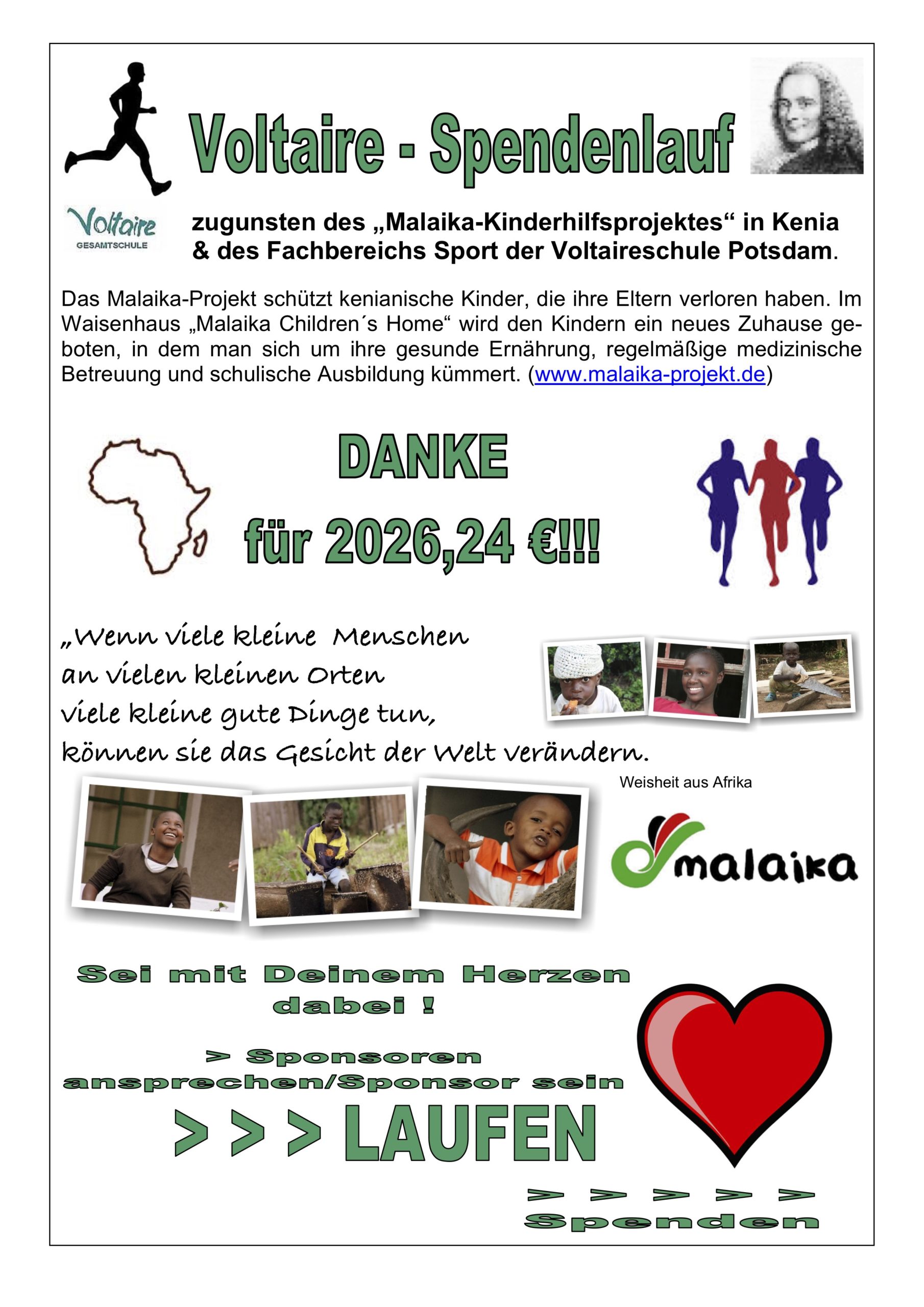 Am 05.06.2019 fand auf dem Sportplatz der Malaika-Lauf der Schülerinnen und Schüler aus den Jahrgangsstufen 5 bis 12 statt. Das Ergebnis des Laufes sehen Sie hier: