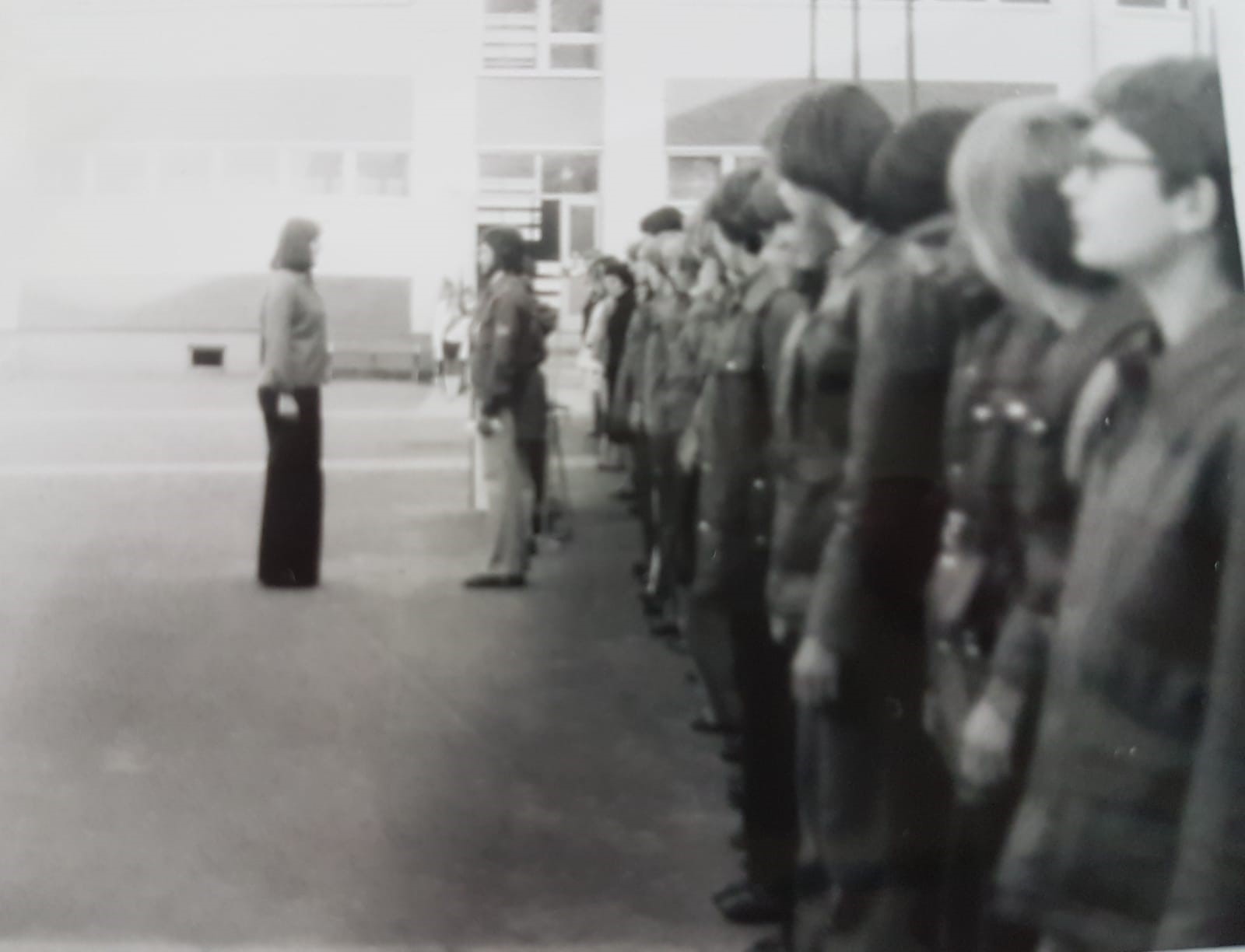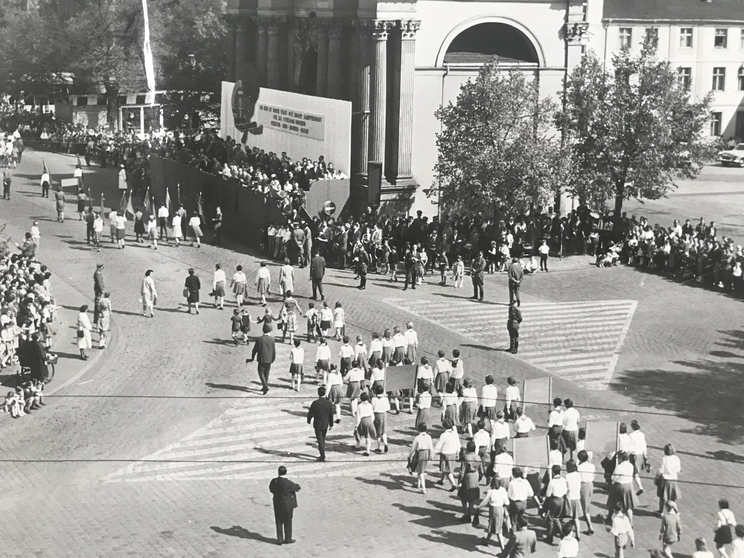 (v.l.n.r.) Marsch der FDJ in Kooperation mit der POS 9 am Brandenburger Tor im Jahre 1968, Schüler der POS 9 salutieren vor der Schulleiterin vor der Schule (1977/78), Voltaireschule im Jahr 1977/1978