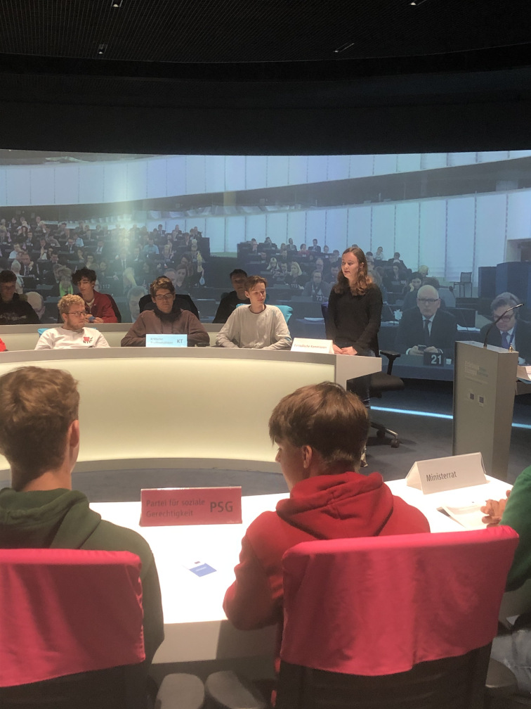 Im Europäischen Haus in Berlin angekommen, begrüßte uns eine sehr freundliche Mitarbeiterin und begleitete uns dann in das 360-Grad-Kino des Hauses. Wir schauten einen kurzen Film über das Europaparlament und darüber, wie dort die Abstimmungen bzw. Debatten ablaufen. Nach dem informierenden Film instruierte uns die Mitarbeiterin, welchen Parteien wir uns zuzuordnen hatten. Daraufhin führten wird eine simulierte Parlamentsdebatte durch. Diese ging über das Thema „Pfand auf To-Go-Kaffeebecher“. Wir kamen zu dem Ergebnis, dass man vorübergehend kein Pfand auf die Kaffeebecher erheben sollte.
