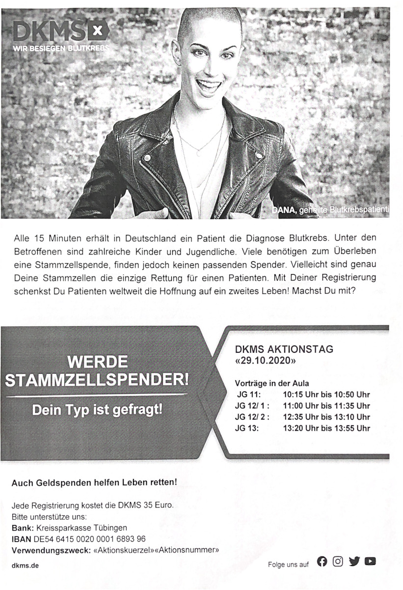 Wir als Schülervertretung haben uns dieses Jahr dazu entschlossen, in Zusammenarbeit mit der DKMS eine schulische Spendenaktion durchzuführen. Im Rahmen des „Dein Typ ist gefragt“-Projektes hatten die Schülerinnen und Schüler der Sekundarstufe II am 29.10.2020 die Möglichkeit, sich selbst als StammzellspenderInnen registrieren zu lassen.