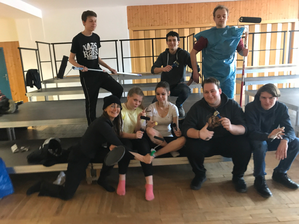 Unter fachkundiger Anleitung von Bernd Jäger wurden große Stellwände gebaut, die variabel als Bühnenrückwand oder Projektionsfläche genutzt werden können. Außerdem sind die Wände des Bühnenraums mit frischem Schwarz versehen, Bühnenpodeste gestrichen worden.